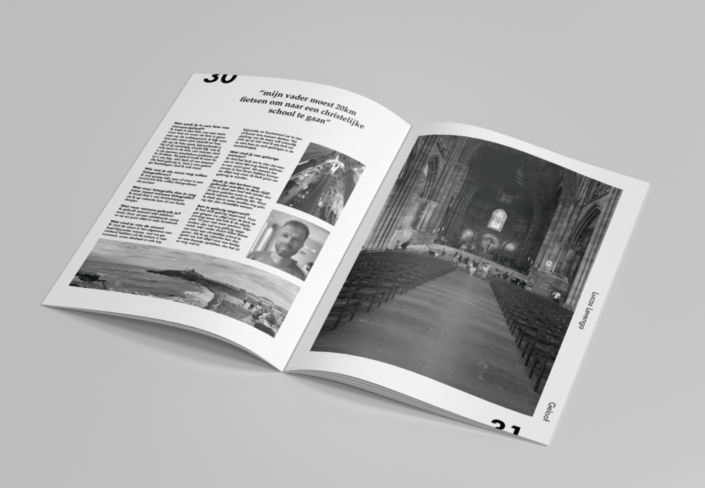 Het doel van dit project was om met een groepje een Kiekiekrant in elkaar te zetten. We werkten in een groep van zeven. Iedereen maakte zijn eigen spread van zijn eigen gekozen onderwerp. Mijn onderwerp was geloof. Ik vind het een interessant onderwerp om in beeld te brengen en ik kon er verhalen en beelden van mijn familie in kwijt. De gebruikte technieken voor dit project waren Indesign en Photoshop.